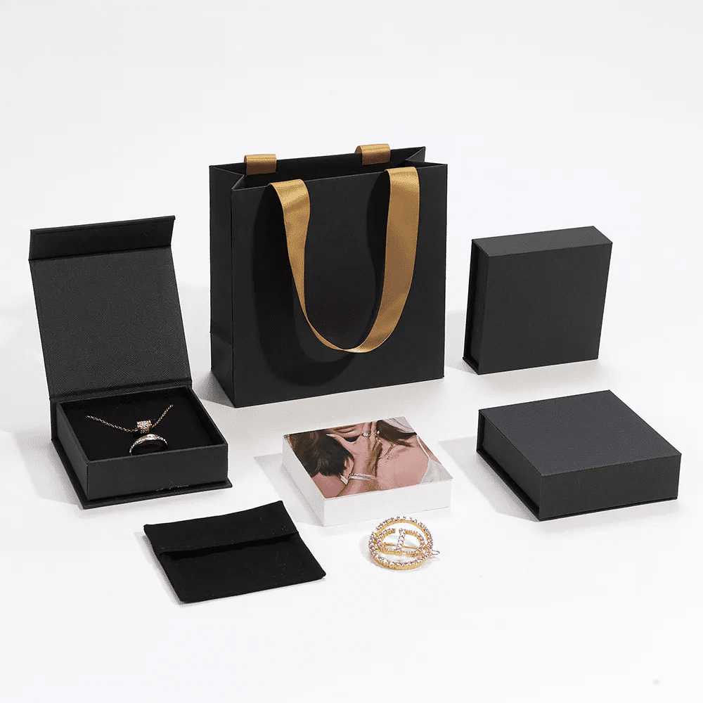 Introducing our brand boutique jewelry retail packaging box, designed to enhance your sales and elevate the customer shopping experience. This stylish box comes with matching gift bags, its thoughtful design not only showcases your jewelry beautifully but also adds a touch of elegance that resonates with your brand identity.