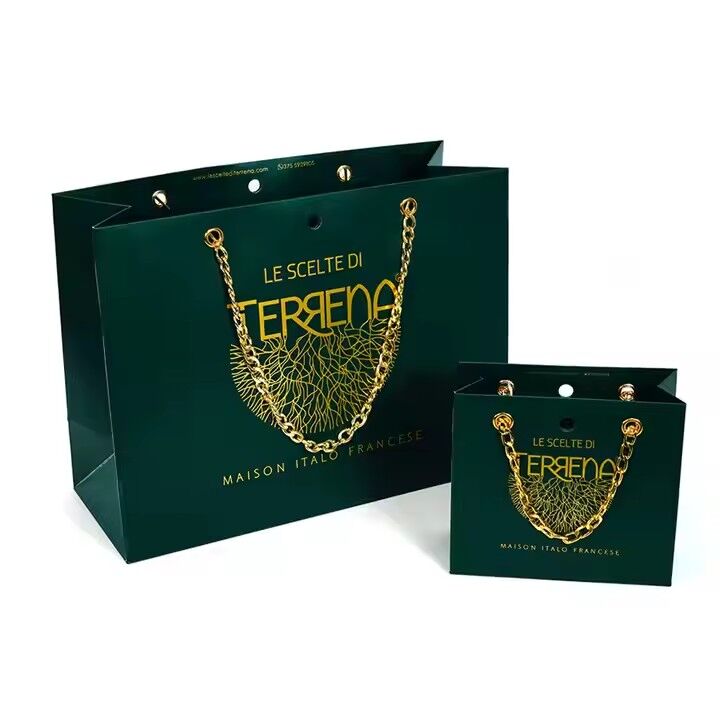 Make a lasting impression with our deluxe paper bags, featuring a stylish chain handle for added sophistication and durability.
