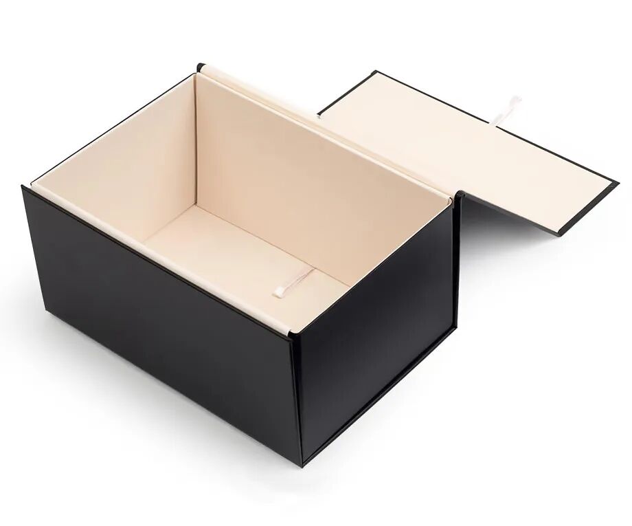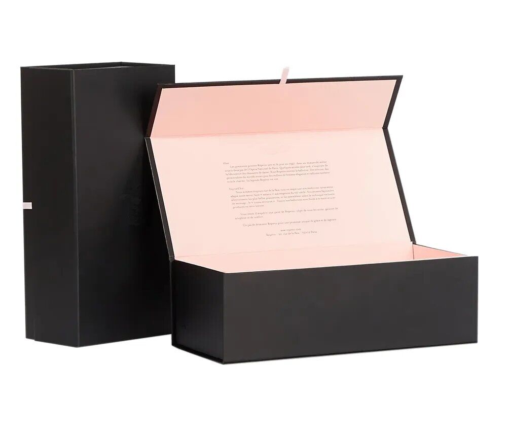 This luxury shoe box, using black and pink matte printing paper, and color matching that is elegant and understated, the body is made of 1200G grayboard paper, making the box strong and durable.The ribbon handle at the opening gives the box a special decorative effect.
