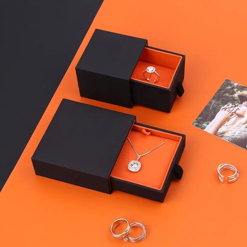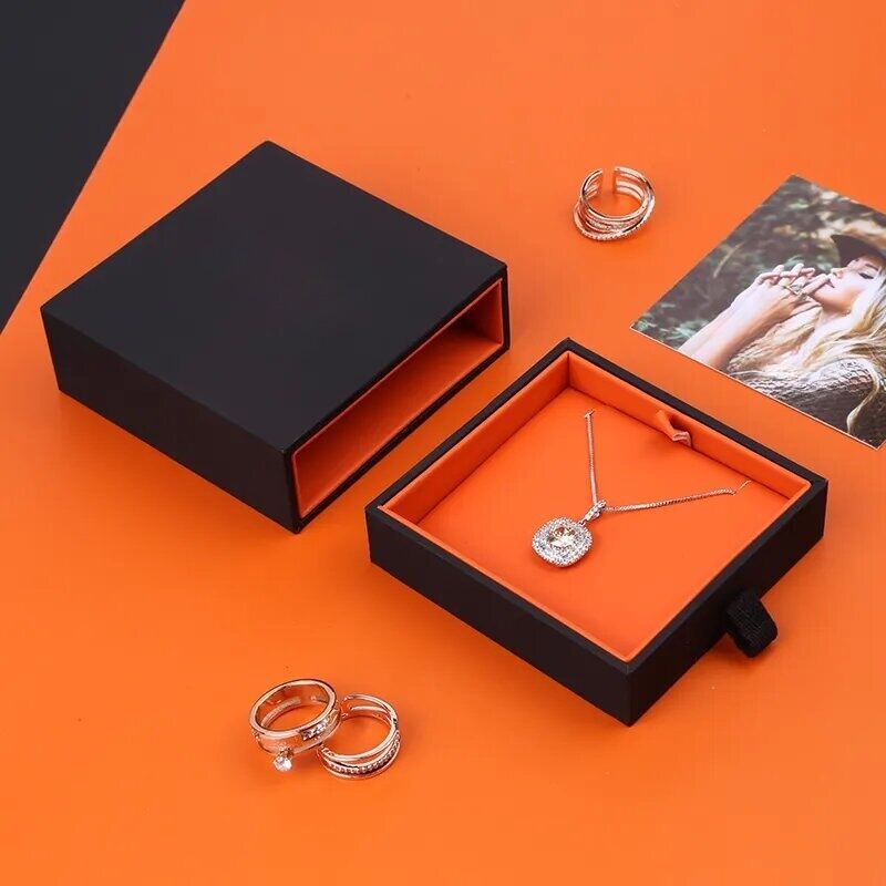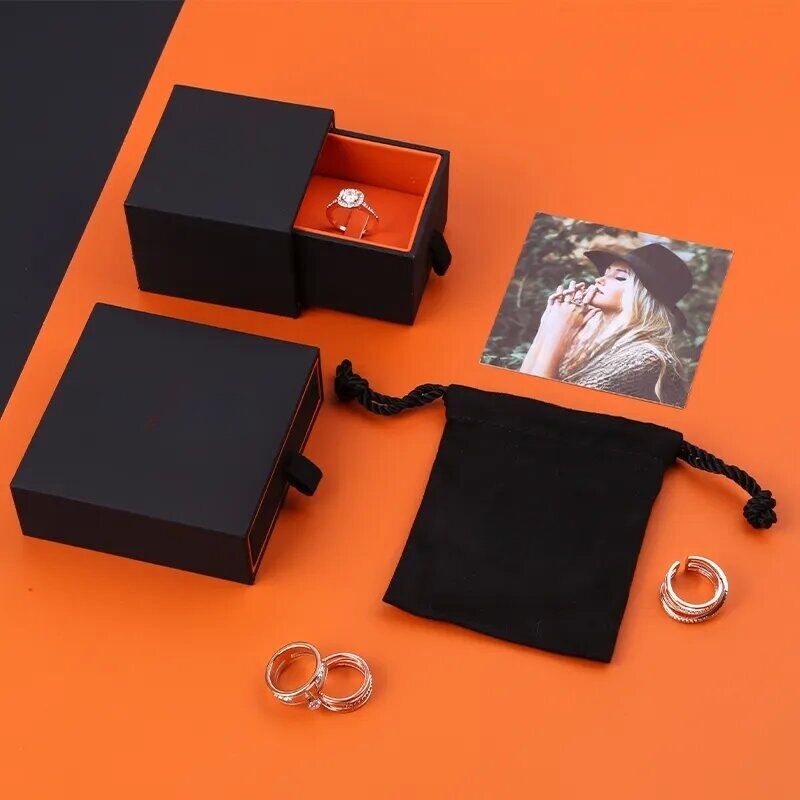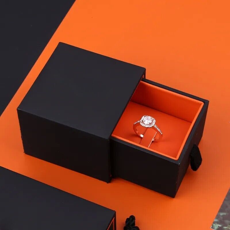 Immerse yourself in the tactile experience of its black soft-touch paper surface, providing a touch of opulence to your treasures. Open the box to reveal a stunning contrast with matching orange velvet, adding a vibrant pop of color that captivates the eye.