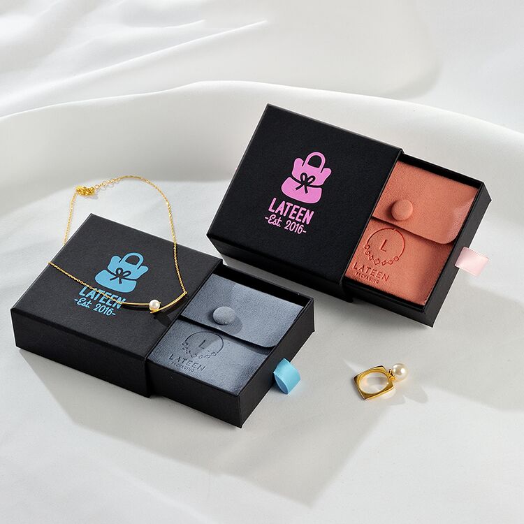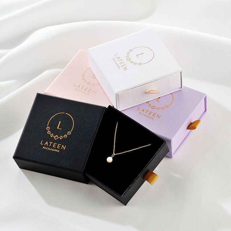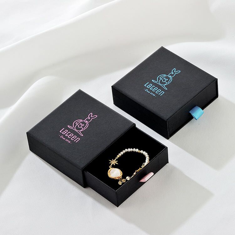 This box is made of high-grade black matte paper with a bright pattern that looks sophisticated and luxurious. The pull-out opening allows the goods to be slowly revealed, giving a surprise. Very popular with young consumers and suitable for personalized jewelry packaging.