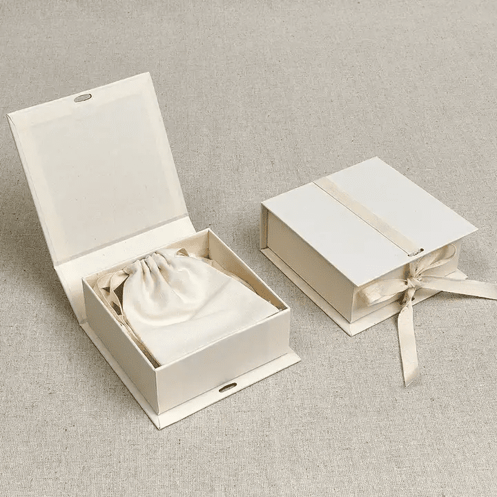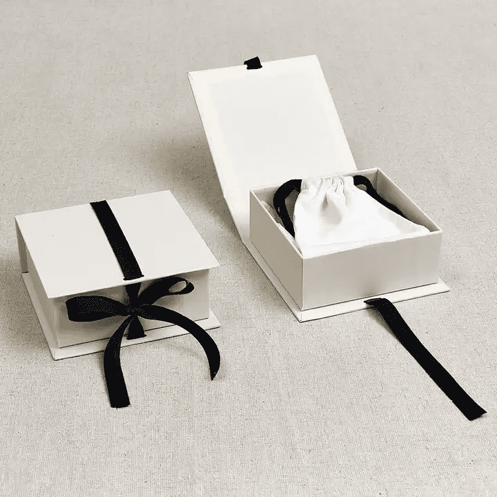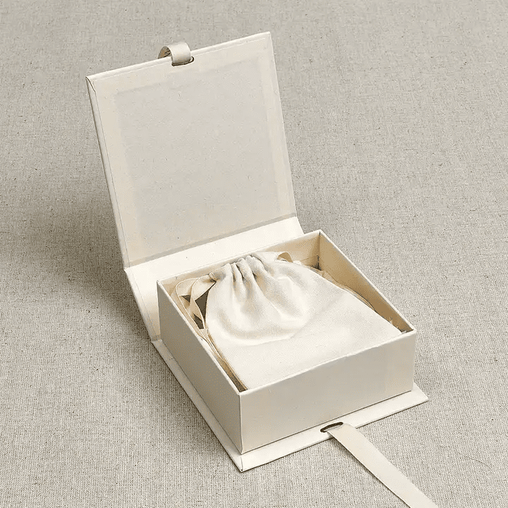 Our eco-friendly paper box is crafted from sustainable art paper and includes a small cloth pouch for versatile jewelry storage. Perfect for retail packaging within the jewelry and accessories industry.