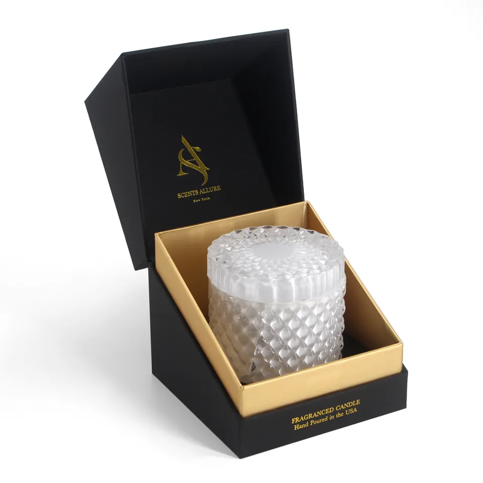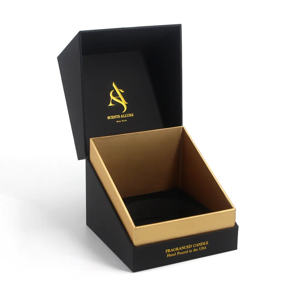 This is a 10oz Candle Container Packaging Box.Slanted opening design for more effective display of goods. The perfect combination of gold and black makes it look more luxurious.Gold stamping of the logo is very impressive.