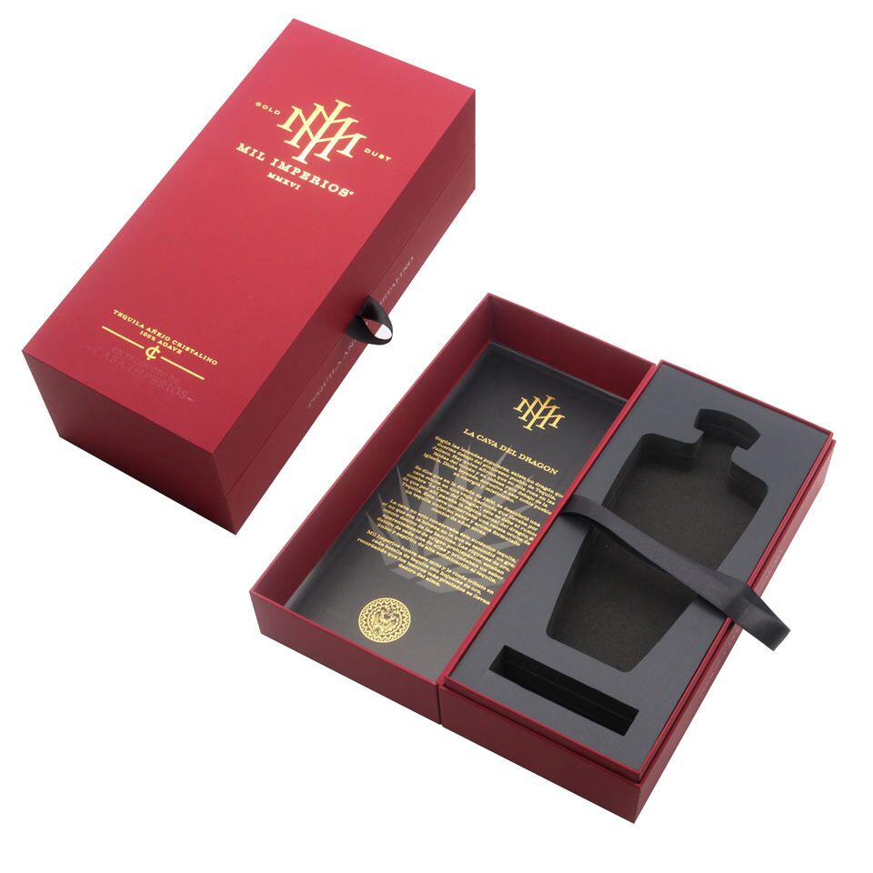 The surface of this opulent box features high-grade red textured paper, complemented by a sophisticated interior of matching black art paper – a tasteful and clever color combination that exudes luxury.